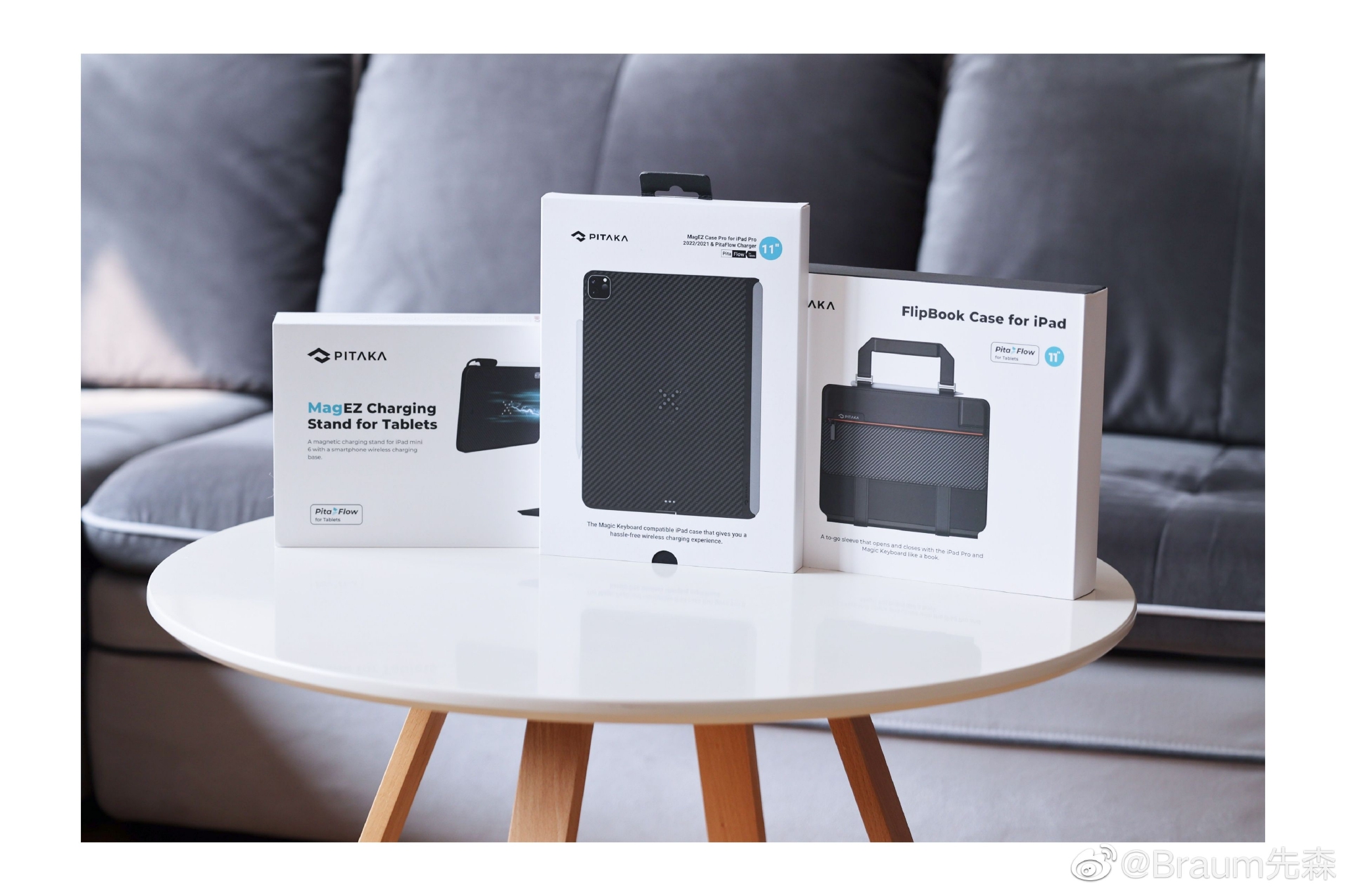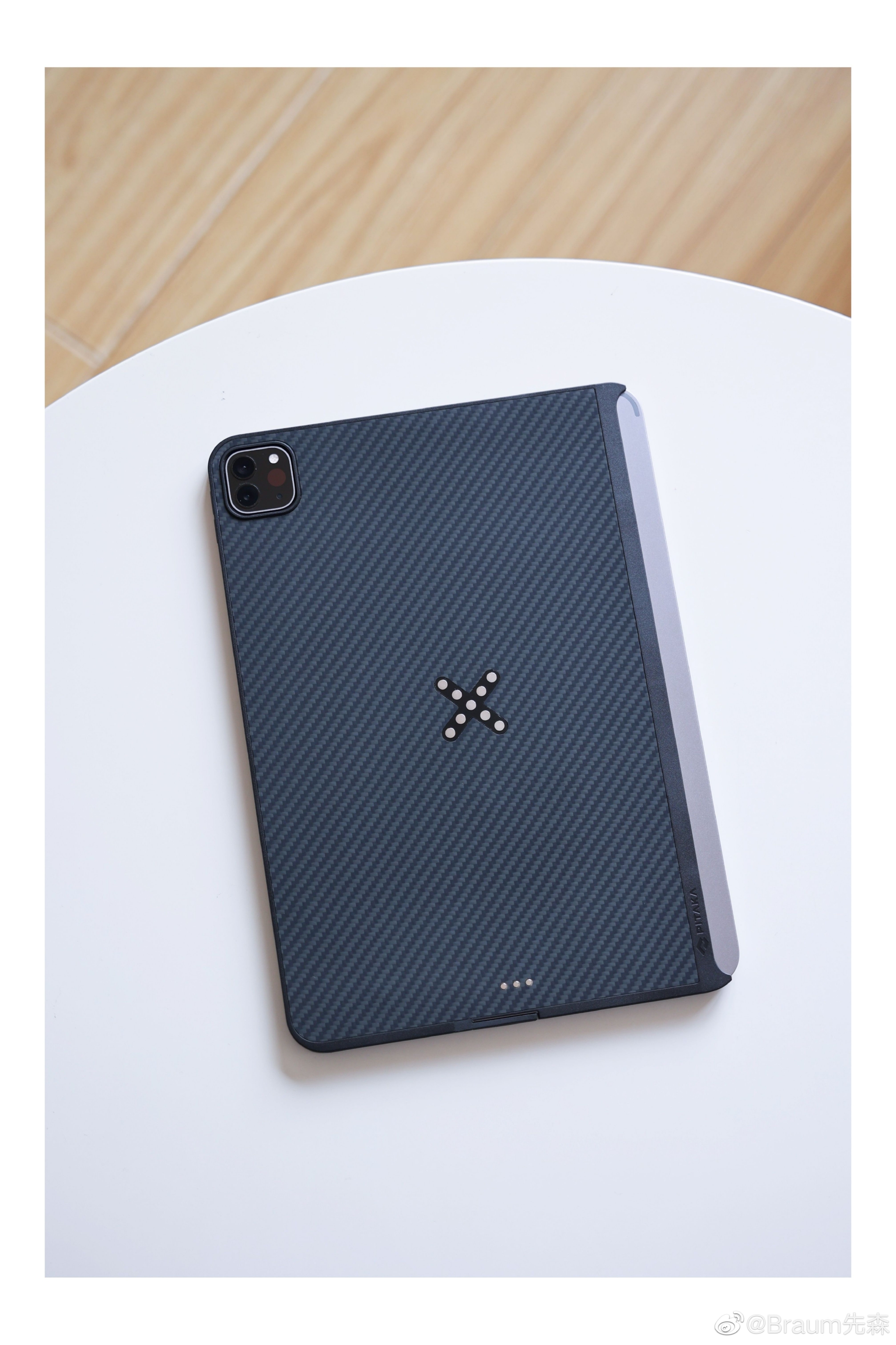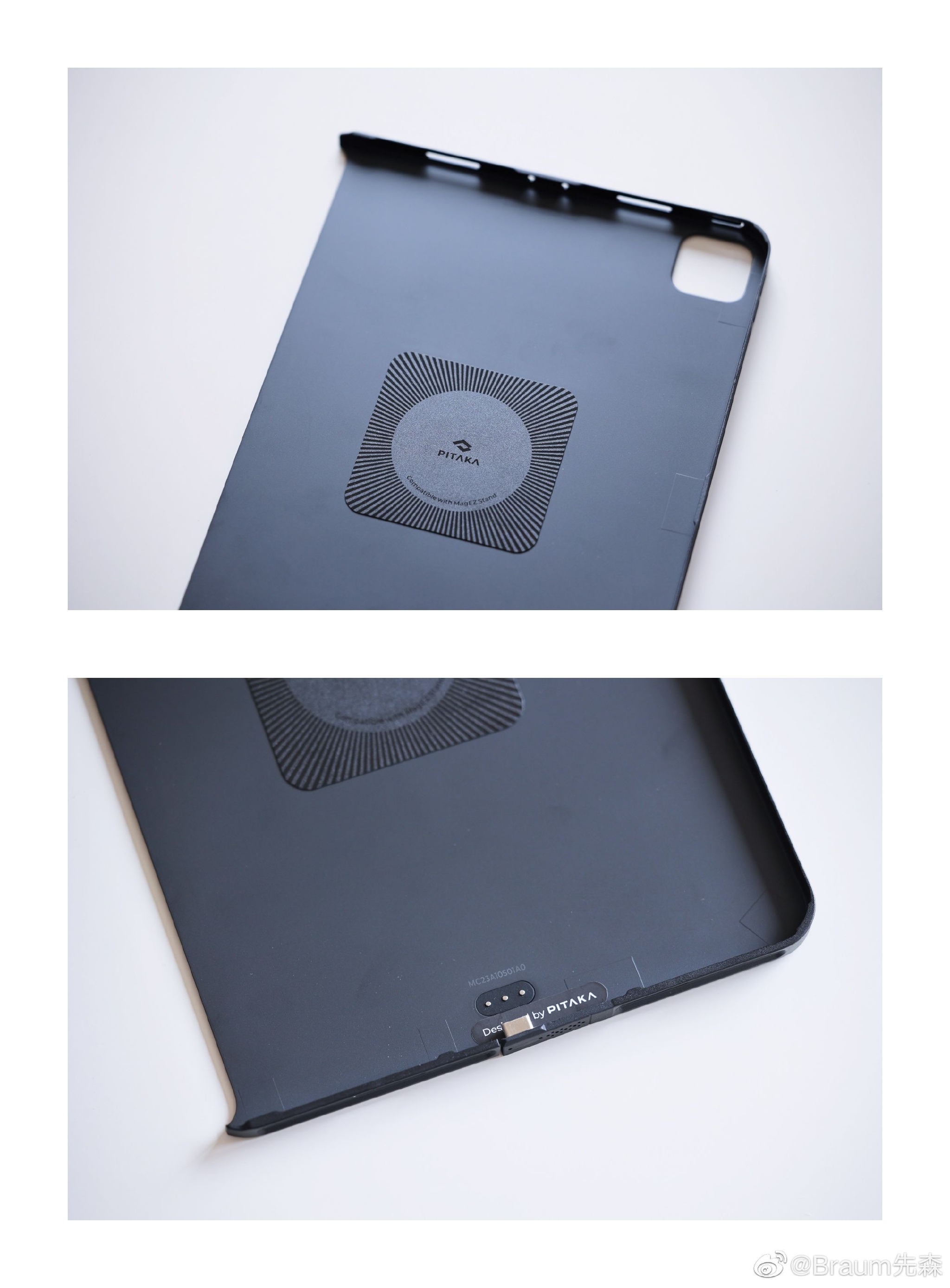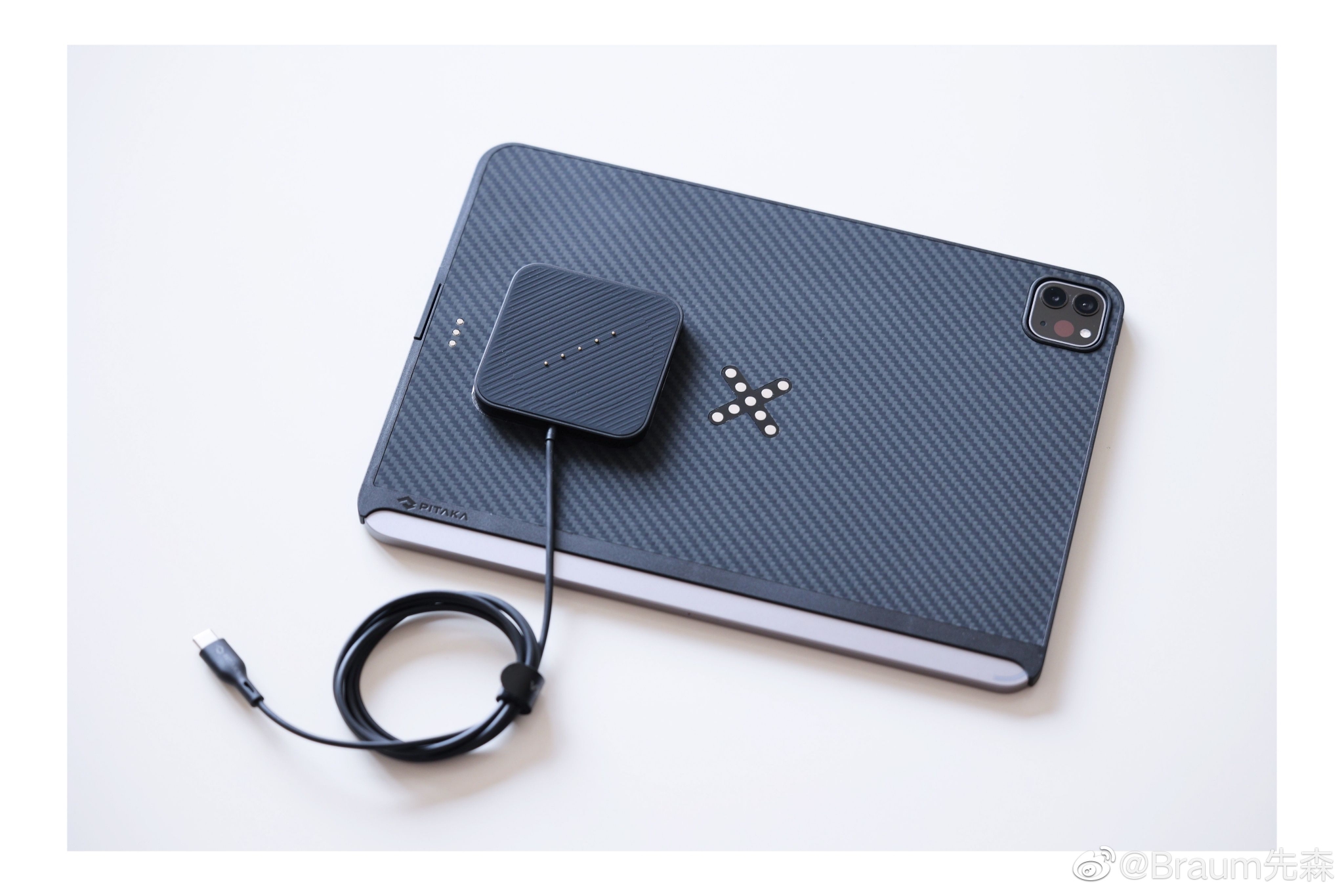 PITAKA这套配件还是挺适合iPad Pro(2022/2021)用户的,等于间接帮iPad Pro实现了无线充电。MagEZ Case Pro磁吸充电壳本身是凯夫拉材质,内置X型触电充电模组,壳子带有USB-C充电口,装壳的时候直接接上,搭配包装内的磁吸充电器,能达到20W的充电功率。