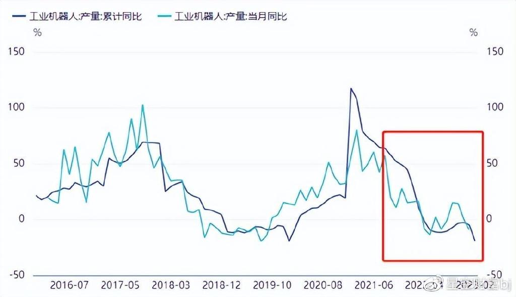 而从工业机器人行业数据来看,自2021年下半年起,工业机器人当月产量同比增速,已开始掉头向下。2022-2023年,则进一步延续了这种下行趋势。