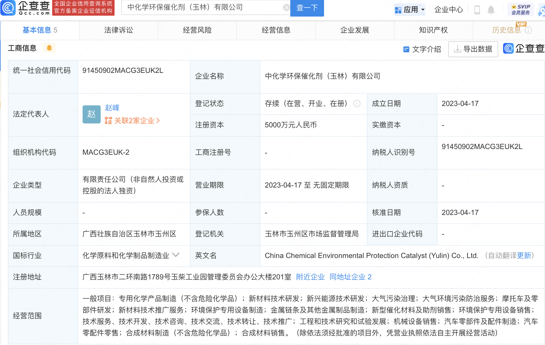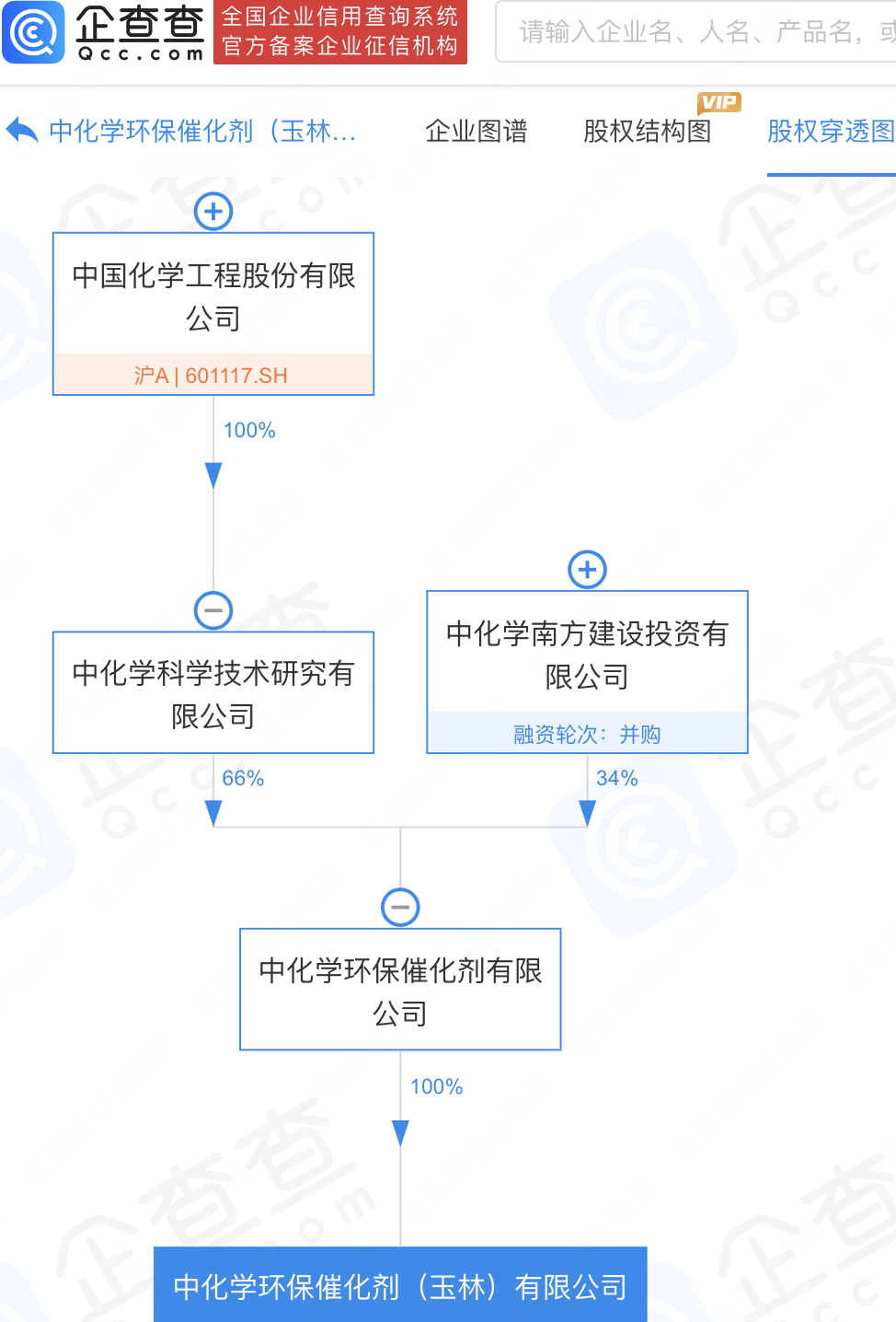 企查查APP显示,近日,中化学环保催化剂(玉林)有限公司成立,法定代表人为赵峰,注册资本5000万元人民币,经营范围包含:新兴能源技术研发;新型催化材料及助剂销售;汽车零部件及配件制造;汽车零配件零售等。企查查股权穿透显示,该公司由中国化学(601117)全资子公司中化学科学技术研究有限公司、中化学南方建设投资有限公司间接共同持股。