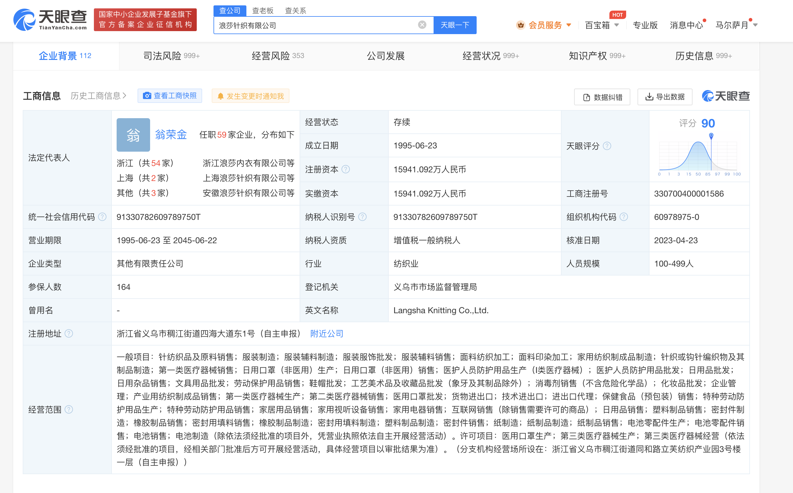 该公司成立于1995年6月,法定代表人、董事长为翁荣金,注册资本约1.59亿人民币,由浪莎控股集团有限公司、义乌蓝也投资有限公司共同持股。