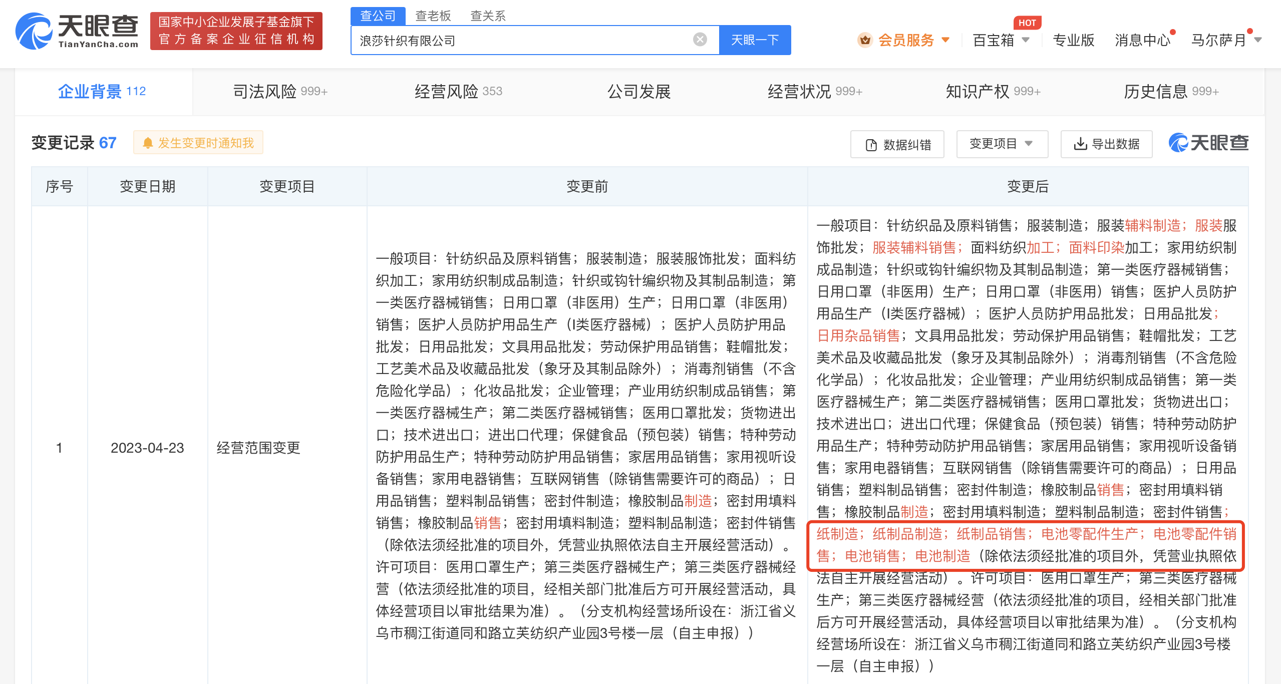 天眼查App显示,近日,浪莎针织有限公司发生工商变更,经营范围新增电池零配件生产、销售;电池制造、销售等。