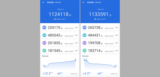 最后尝试在安兔兔中跑分,总成绩也从1124118分提升到了1133591的总分,虽然分数不多,但也再次证明温度是影响手机性能的主要因素之一,并且跑出高分时监控温度也降至30℃左右。