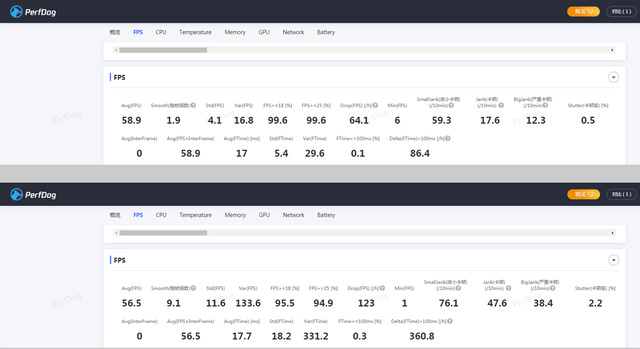 通过PerfDog性能狗的Drop值可以看到,有夹与无夹差距非常明显。Drop值越大,卡顿次数越多,反之值越小,卡顿次数越少,游戏也就更平稳。很明显高温确实容易导致数值有了变化,从而使帧数出现明显波动。