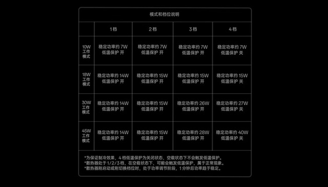 简单说,如果是在18W工作模式下,那么4档的稳定功率在15W左右。而顶格45W工作模式时,4档的稳定功率能达到40W。