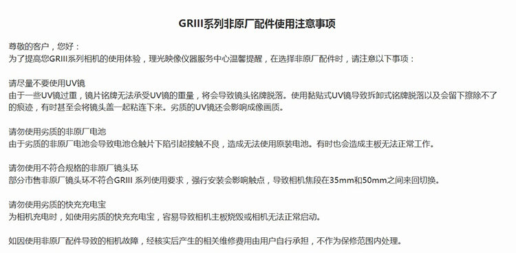 近日,理光映像发布了一条关于固定镜头相机GRIII系列的注意事项,表示如果用户在使用该系列相机时,如故障原因是由非原厂配件导致相机出现故障的话,理光官方将不会提供报修服务。