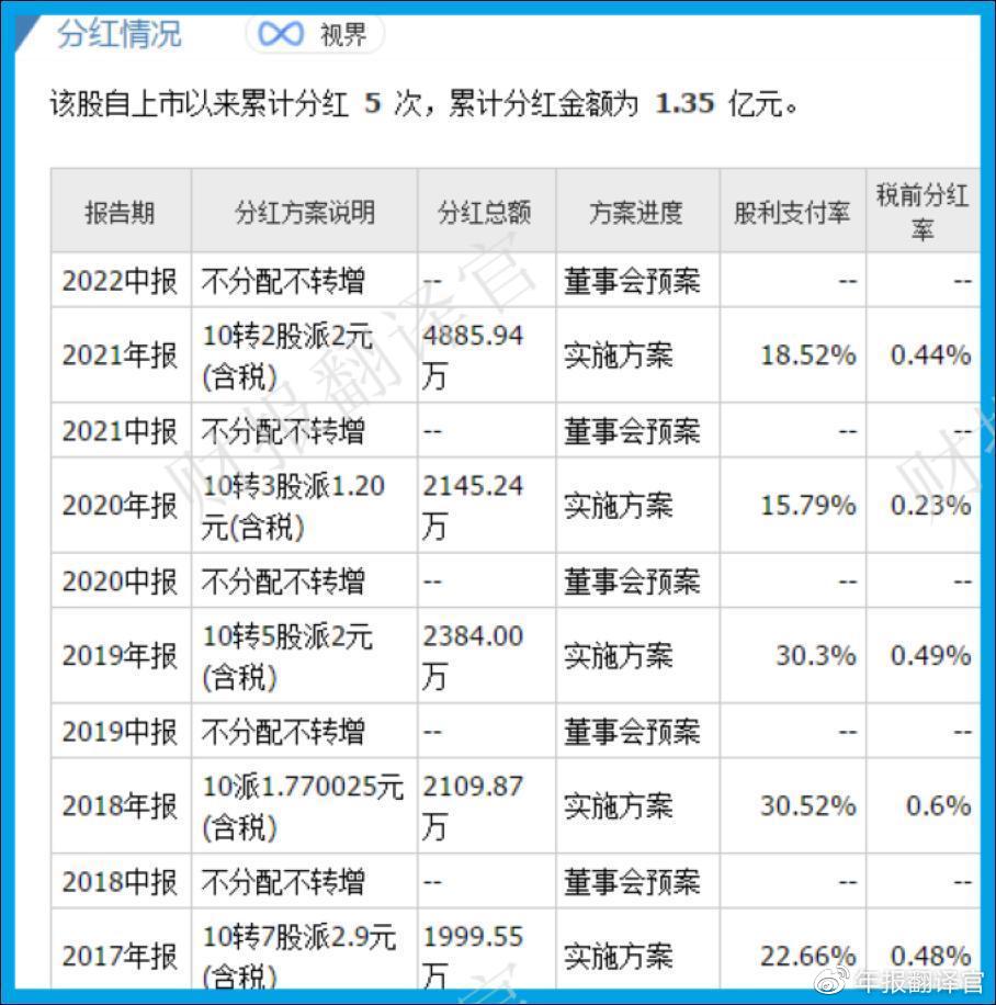 而从董秘的口中翻译官还得知,这家公司自上市以来累计派发现金1.35亿元,并在近期为股东分了5次红,分红占净利润的平均比重在25%左右。