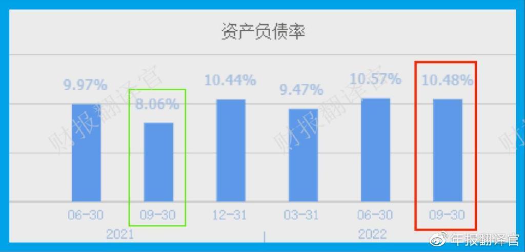 2021年第三季度,这家公司100元的资产里只有8.06元是借来的,资产负债率为8.06%。而到了2022年第三季度,该企业的资产负债率就达到了10.48%,同比增长了30%。