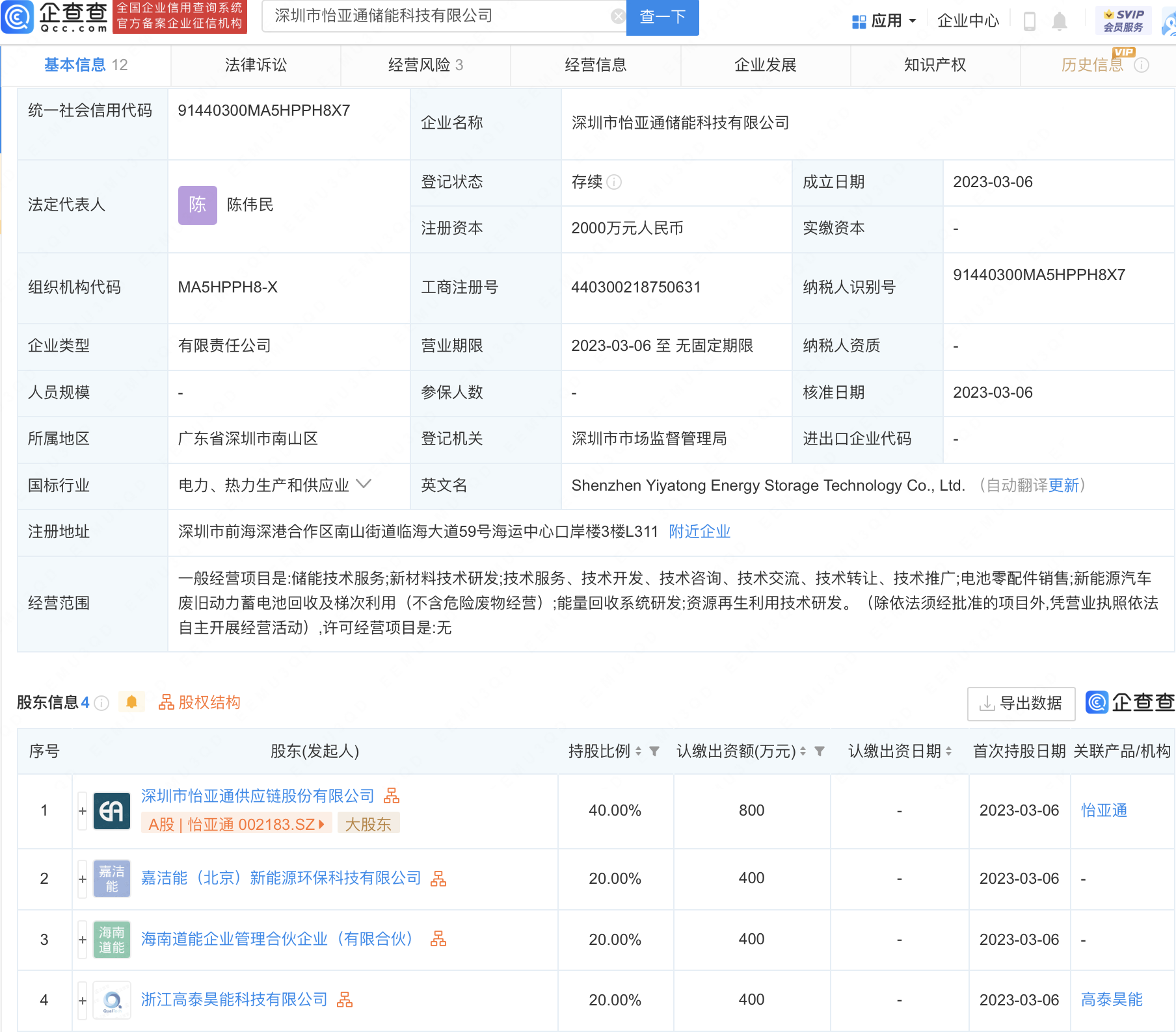 企查查APP显示,近日,深圳市怡亚通储能科技有限公司成立,法定代表人为陈伟民,注册资本2000万元人民币,经营范围包含:储能技术服务;新材料技术研发;电池零配件销售;能量回收系统研发等。企查查股权穿透显示,该公司由怡亚通(002183)等共同持股。
