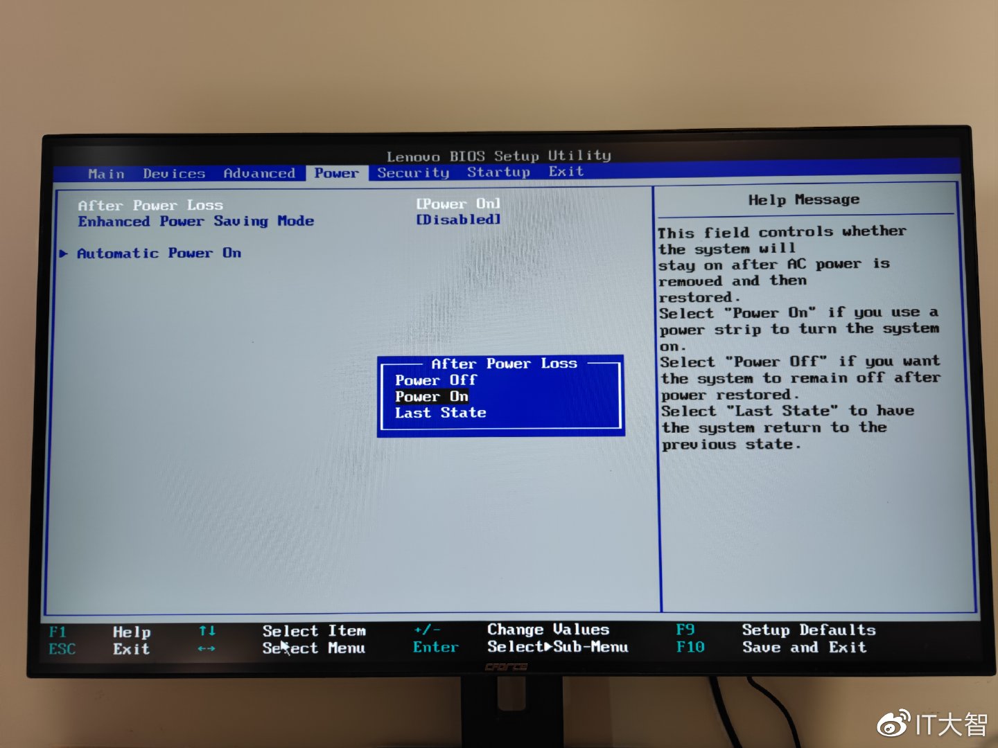 第一步要让插座能够控制计算机,这里要用到计算机的通电自启功能,以我的联想电脑为例,在BIOS中的“Power”选项,将“After Power Lose”的状态改为“Power On”,意思是电脑掉电后再次通电时电脑的状态,我们选择的是通电开机,保存设置后我们远程开启C1 Pro给电脑送电电脑就会正常启动。该功能为台式电脑标配,不同的主板品牌选项名称可能不同,但结果都一样。