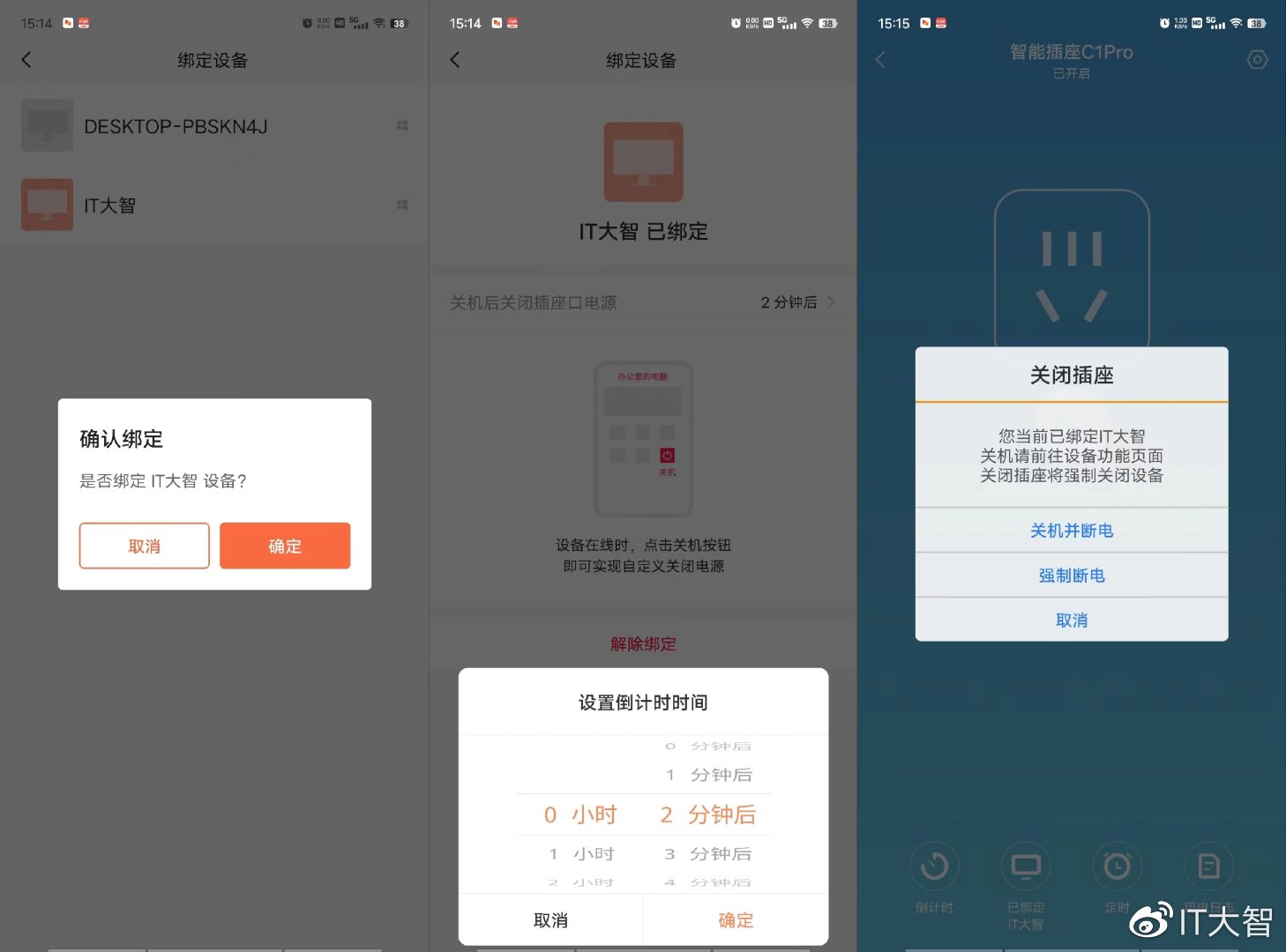 第三步,我们把电脑主机的电源线插在C1 Pro上,然后在APP端的C1 Pro功能页面的“绑定设备”选项中把第二步需要远程控制的电脑添加进去,这样就实现了远程开关该电脑功能。