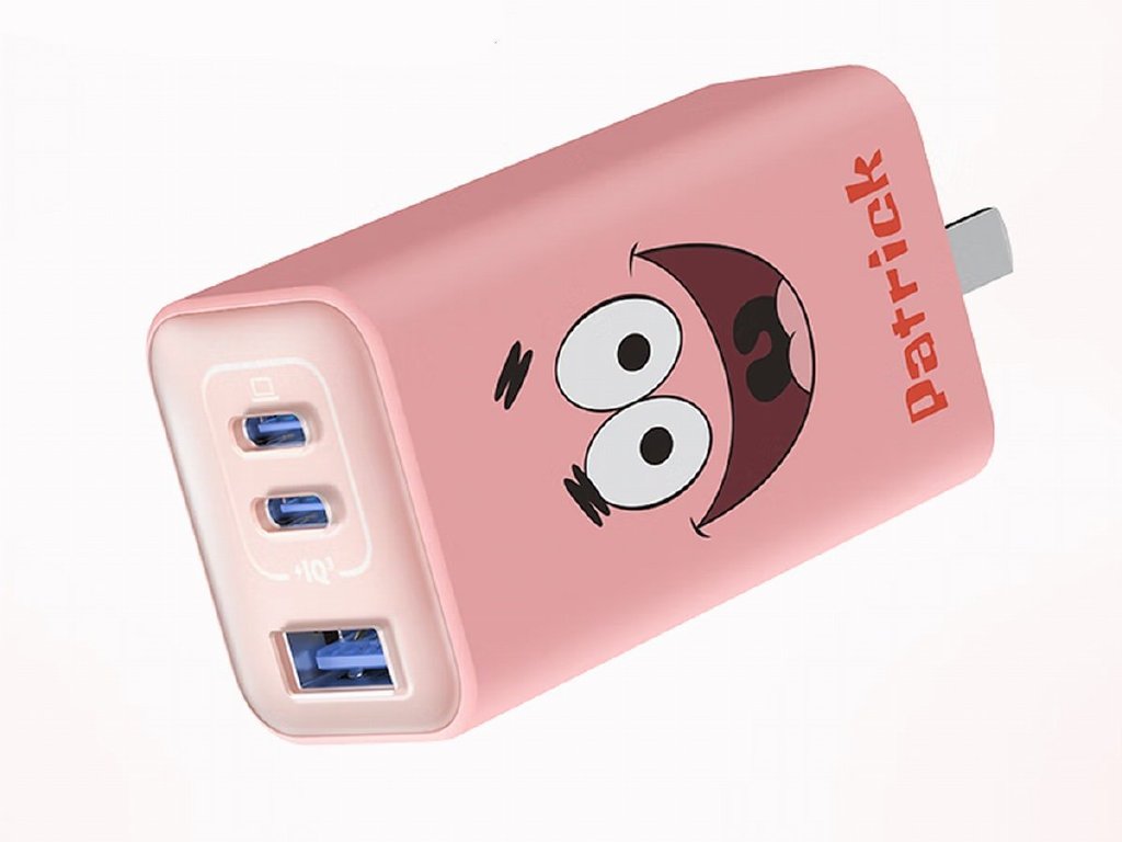 派大星氮化镓充电器采用粉色涂装,并印有派大星笑脸,最大输出功率 65W,至高支持笔记本充电,可同时供多个设备使用。采用折叠插脚设计,支持 100-240V 50/60Hz 全球电压,三围尺寸 66.3*29.1*38.6mm,功率密度 0.87W/cm³。