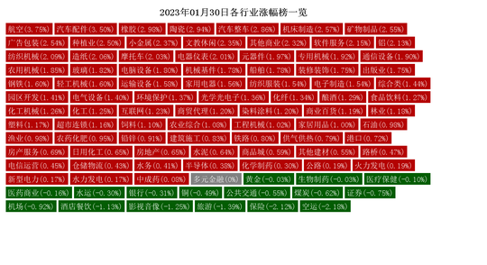今日涨幅居前的行业有:航空(3.75%)、汽车配件(3.5%)、橡胶(2.98%)、陶瓷(2.94%)、汽车整车(2.86%)、机床制造(2.57%)、矿物制品(2.55%)、广告包装(2.54%)、种植业(2.5%)、小金属(2.37%)。