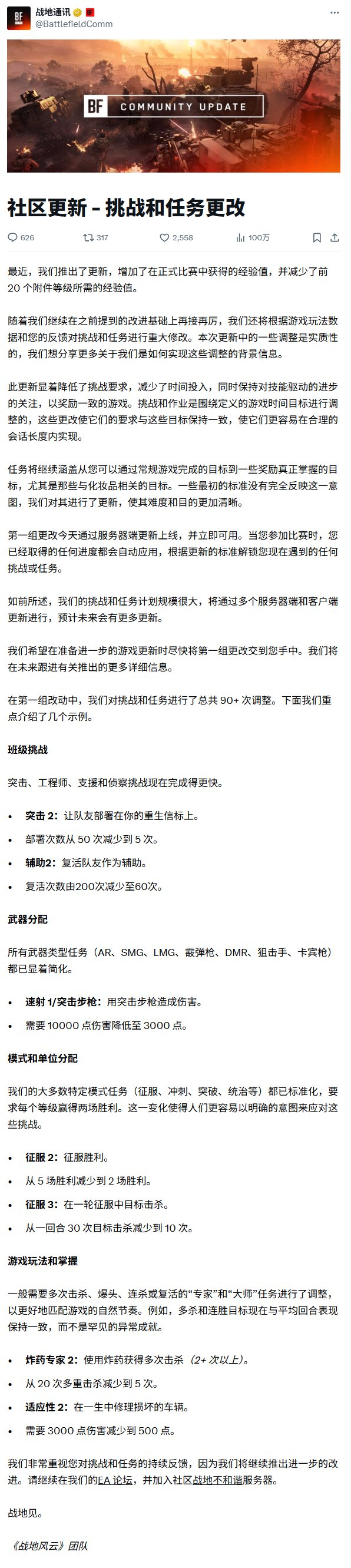 《#战地6#》武器配件的获取难度下调(例如武器任务的重做,原有的标准下调等等),并且提高了经验获取效率。#战地风云6#